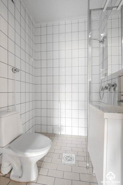 - WC-istuin, suihku, pesukoneliitäntä, suihkuseinä, ja peilikaappi