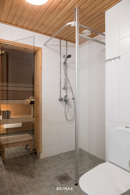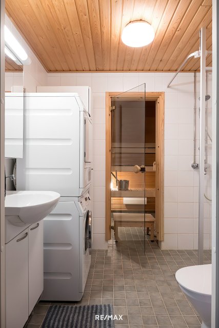 - Pesukoneliitäntä, lattialämmitys, suihku, wc-istuin, pesuallas, peilikaappi, suihkuseinä, ja allaskaappi