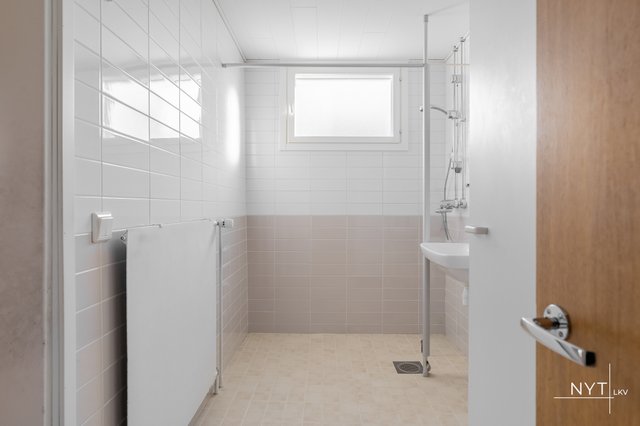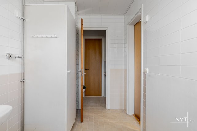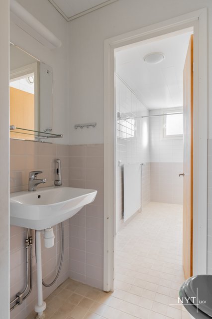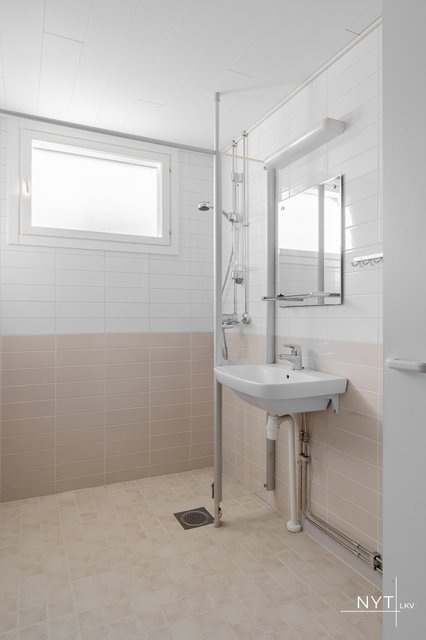 - Suihku, suihkuseinä, pesuallas, ja pesukoneliitäntä
