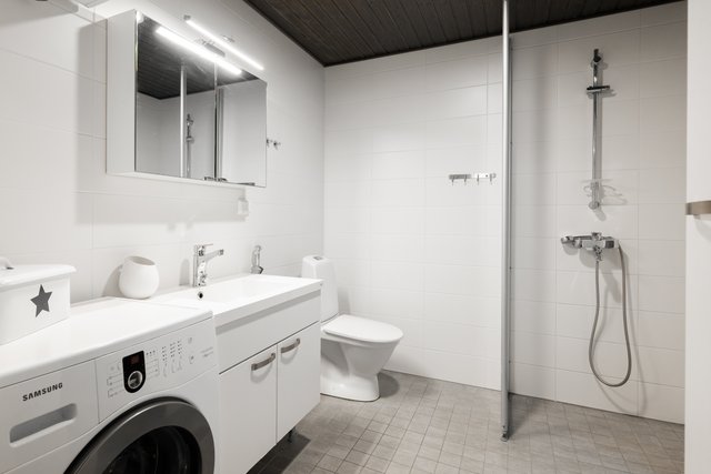 - WC-istuin, suihku, suihkuseinä, pesukoneliitäntä, lattialämmitys, peilikaappi, pesuallas, allaskaappi, bidee-suihku, ja kaapisto