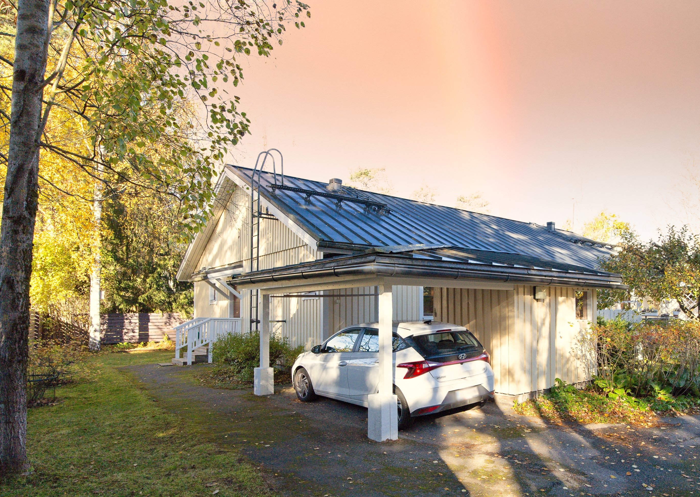 Yksitasoinen paritalo hyvillä liikenneyhteyksillä ja läheltä koulua. Oma autokatos!