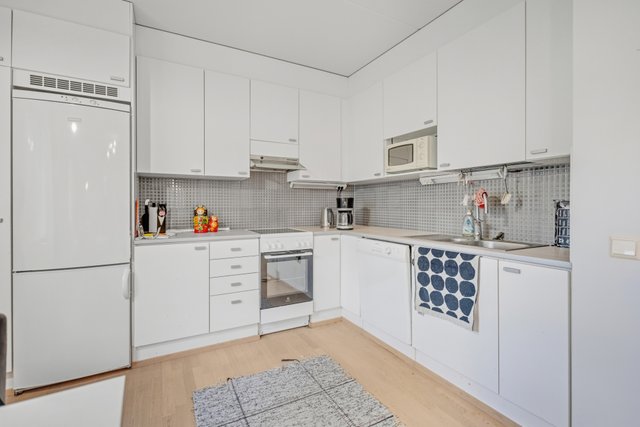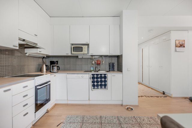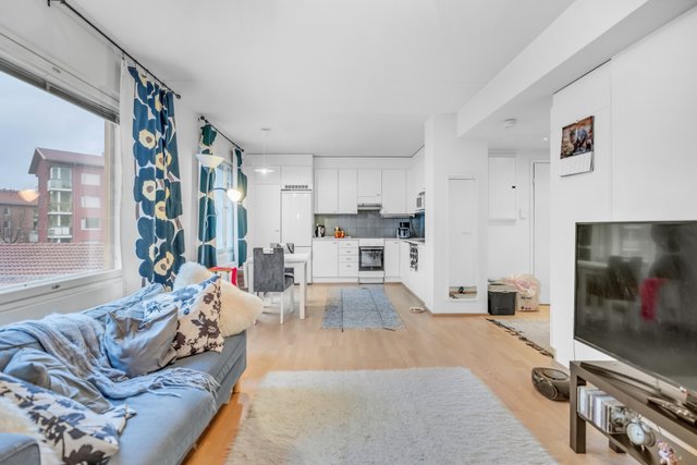 Kodissa on kauniit vaaleat pinnat. Olohuoneen ja avokeittiön avara kokonaisuus, tilava makuuhuone runsailla kaapistoilla sekä toimiva kylpyhuone lattialämmityksellä tekevät arjesta mukavaa.