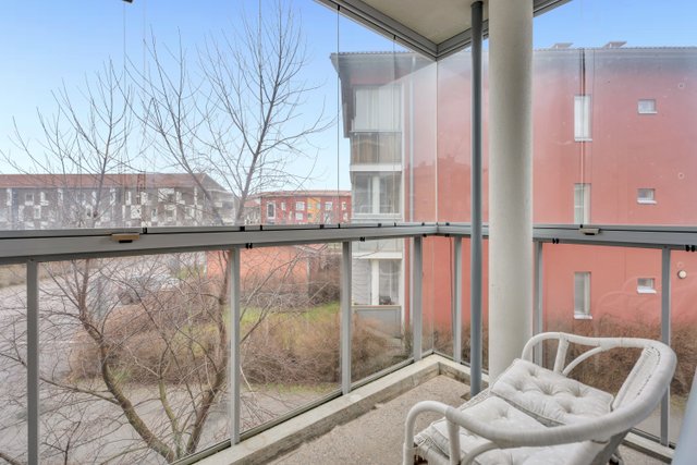 Kodissa on suuri, lasitettu parveke, joka avautuu itään ja toimii viihtyisänä lisähuoneena aikaisesta keväästä pitkälle syksyyn.