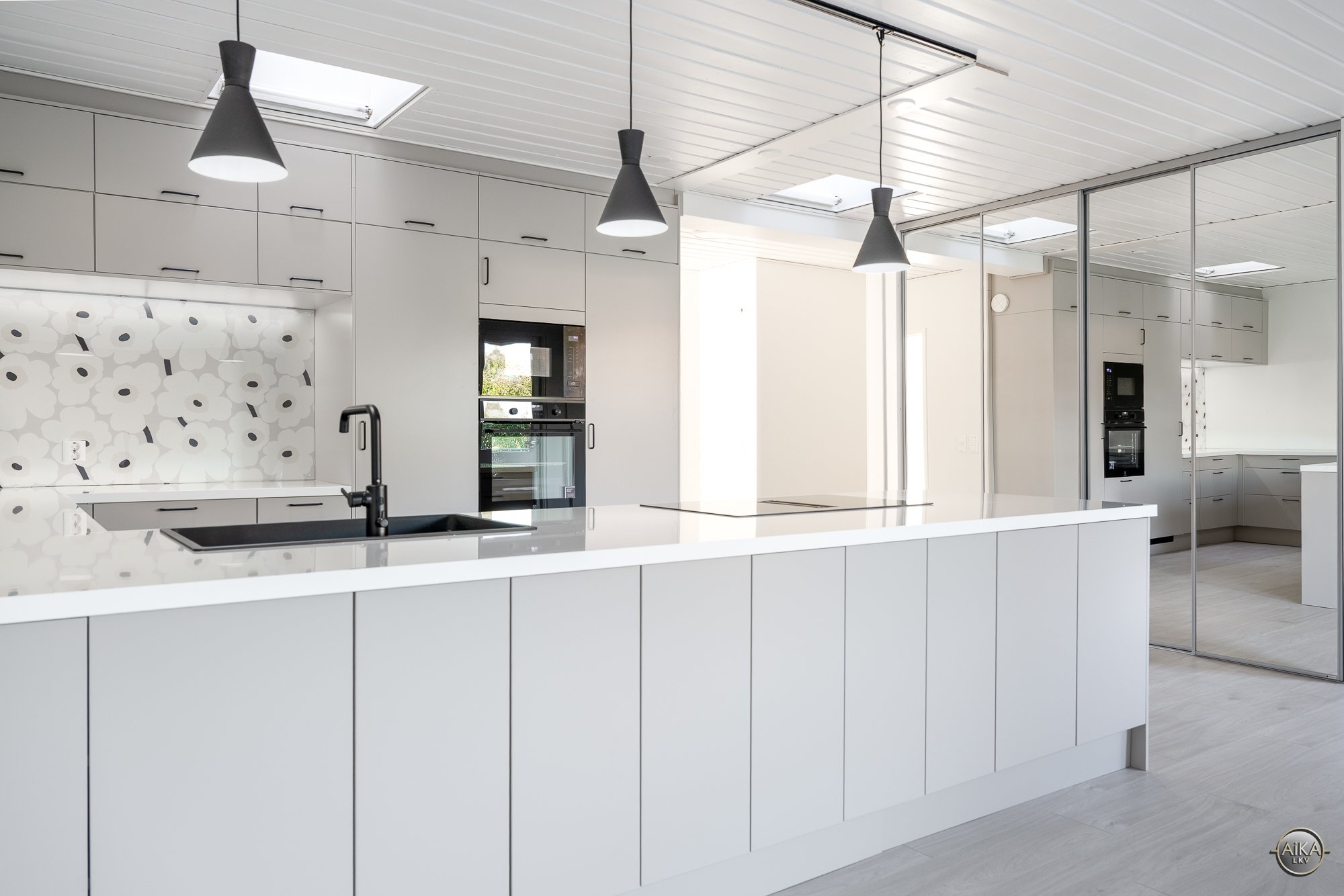 Uusittu keittiö hurmaa modernilla ilmeellään ja käytännöllisyydellään – integroidut kodinkoneet, runsaat kaappi- ja laskutilat sekä näyttävä, tilava niemeke tekevät kokkaamisesta nautinnon. Niemeke avautuu olohuoneeseen, luoden yhtenäisen ja avoimen oleskelutilan koko perheelle.