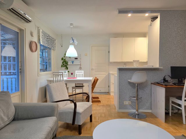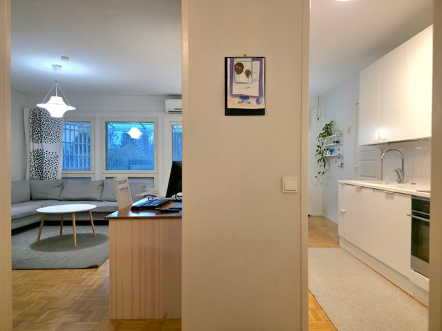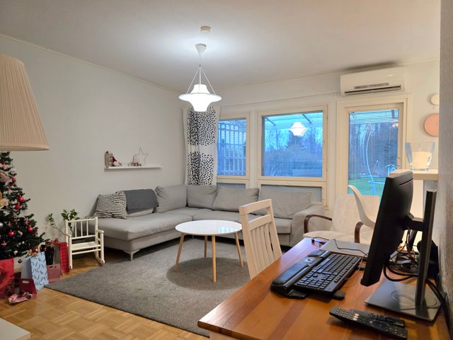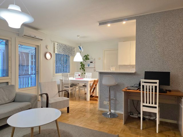 Avara olohuone / keittiöosasto. Erillinen wc. Lattiat palaparkettia ja laminaattia. Seinät maalipinnalla. Olohuoneesta käynti katetulle terassille, joka takapihan suuntaan. Oma piha-alue, jonka lisäksi reippaan kokoinen yhteispiha.