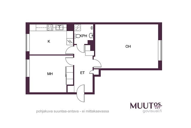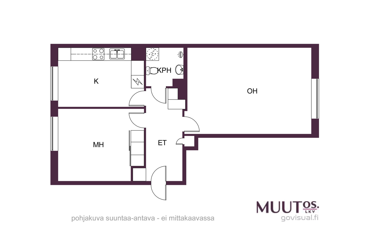 - Edellä mainittu pinta-ala saattaa tämän ikäisessä kohteessa poiketa olennaisestikin huoneiston nykyisen ja rakentamisaikaisen mittaustapojen ja standardien mukaan laskettavasta pinta-alasta. Huoneiston todellinen pinta-ala voi olla yhtiöjärjestyksessä, isännöitsijäntodistuksessa ja esitteessä mainittua pienempi tai suurempi. Hinta ei ole pinta-alaperusteinen. Yhtiöjärjestyksen mukainen huoneistoselitelmä: 2h+k.