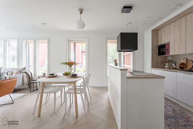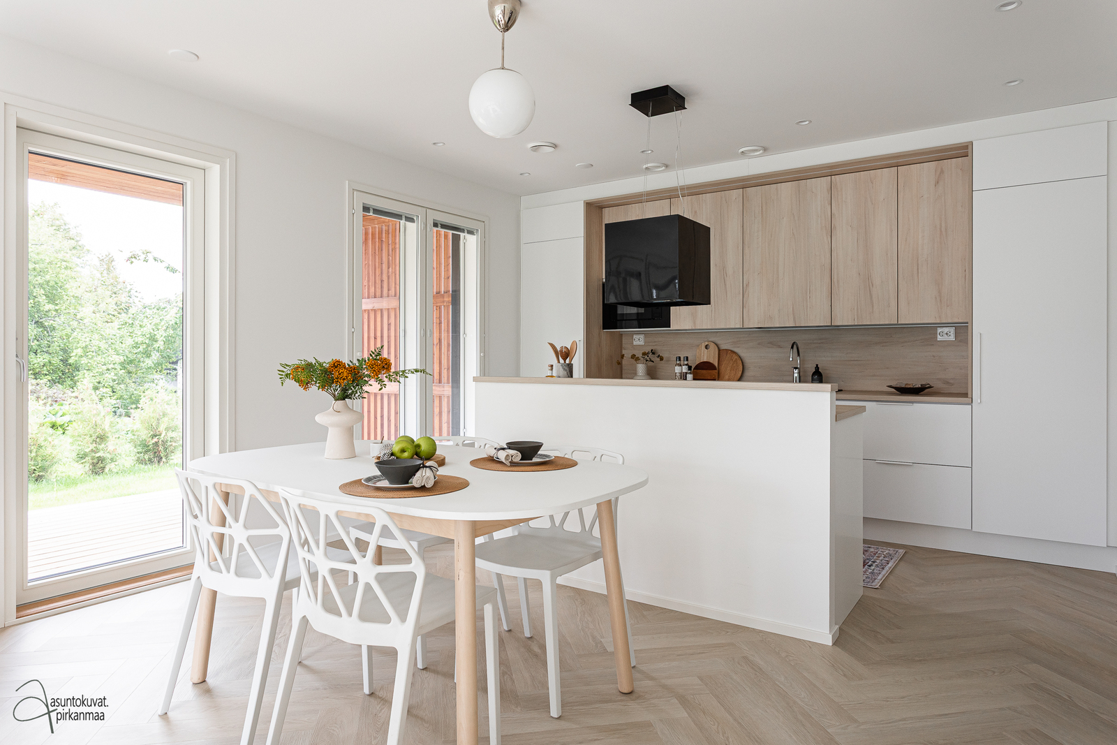 - Lattia kalanruotovinyyli, seinät maalattu. Integroitu jääkaappi, pakastinkaappi, induktioliesi, erillisuuni, liesituuletin, astianpesukone, integroitu mikroaaltouuni.