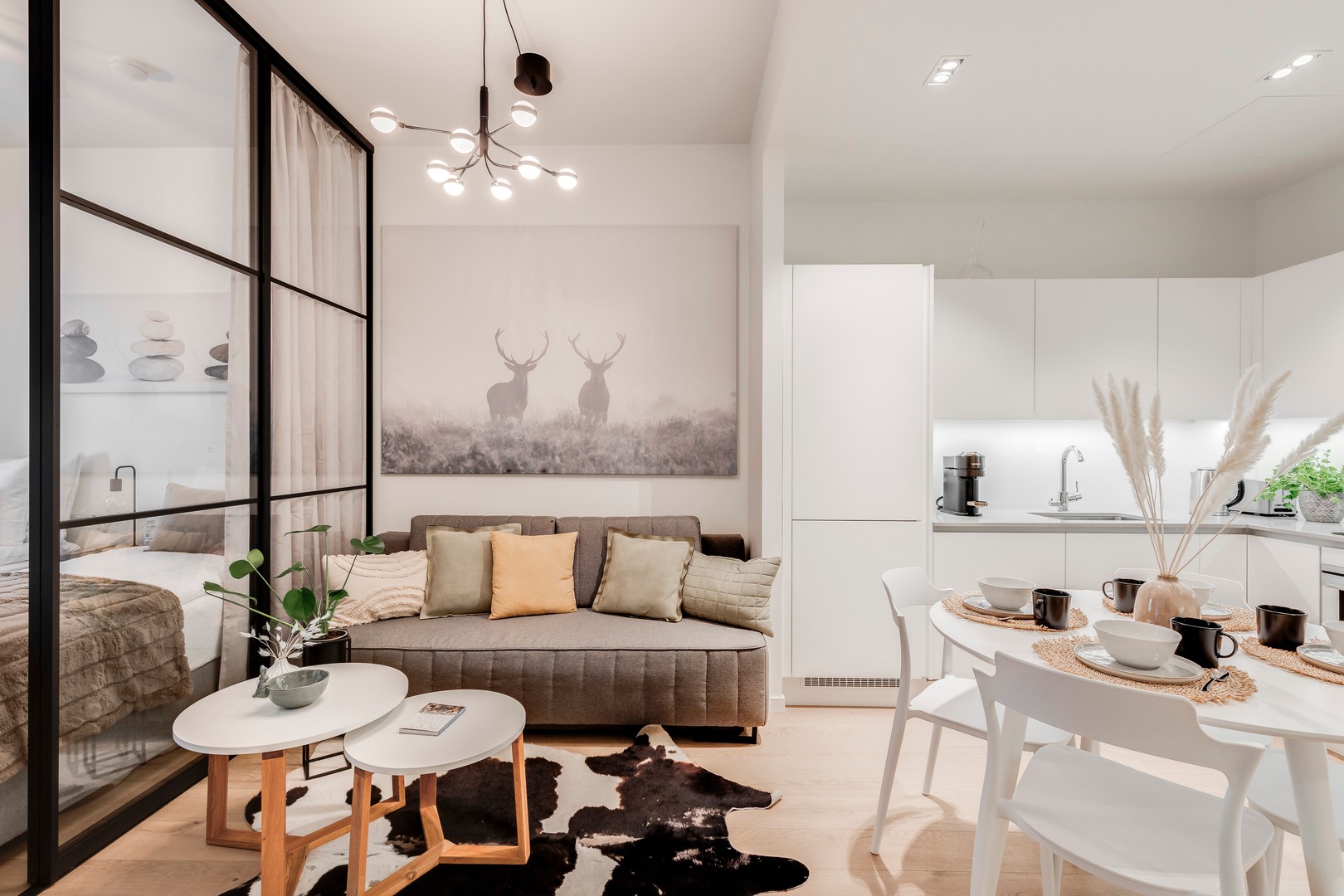 Olohuoneeseen on tehty mittatilaustyönä kauniit lasiset liukuovet, joiden avulla tilan voi jakaa mukavasti toiseksi makuuhuoneeksi, työtilaksi tai vaikka rauhalliseksi vierashuoneeksi. Ovet voi myös helposti poistaa, jolloin olohuone avautuu yhtenäiseksi ja tilavaksi kokonaisuudeksi.
