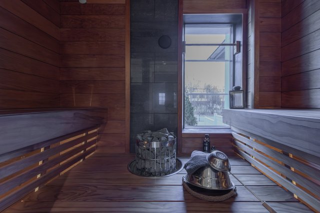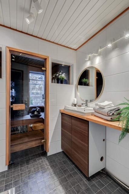 - Saunassa ikkuna, 2 poistoilmanvaihtoventtiiliä, tuloilmaventtiili, lauteet lämpökäsiteltyä mäntyä ja seinäpanelit loimu tervaleppää. Sähköiuas.