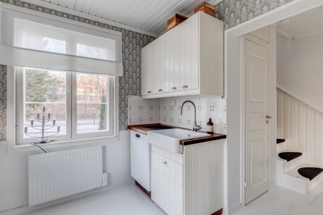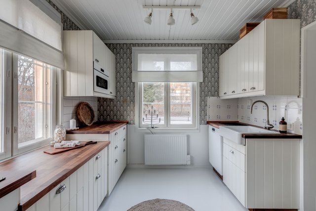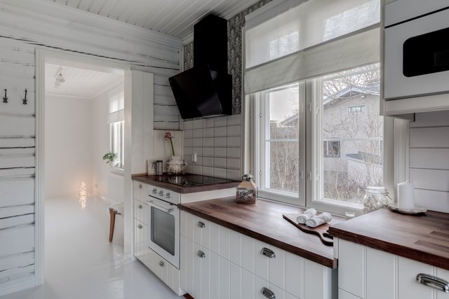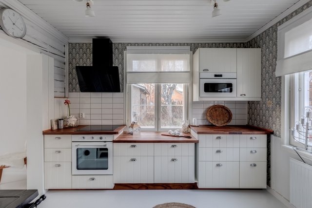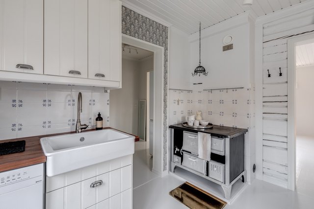 - Valkoiset kaapistot, tasot uusittu, keraaminen liesi, astianpesukone, integroitu mikro, jääk/pakastin (n.1v.), liesituuletin aktiivihiilisuodatin, uuni, Pietarsaaresta puuhella, valupohja 1998.