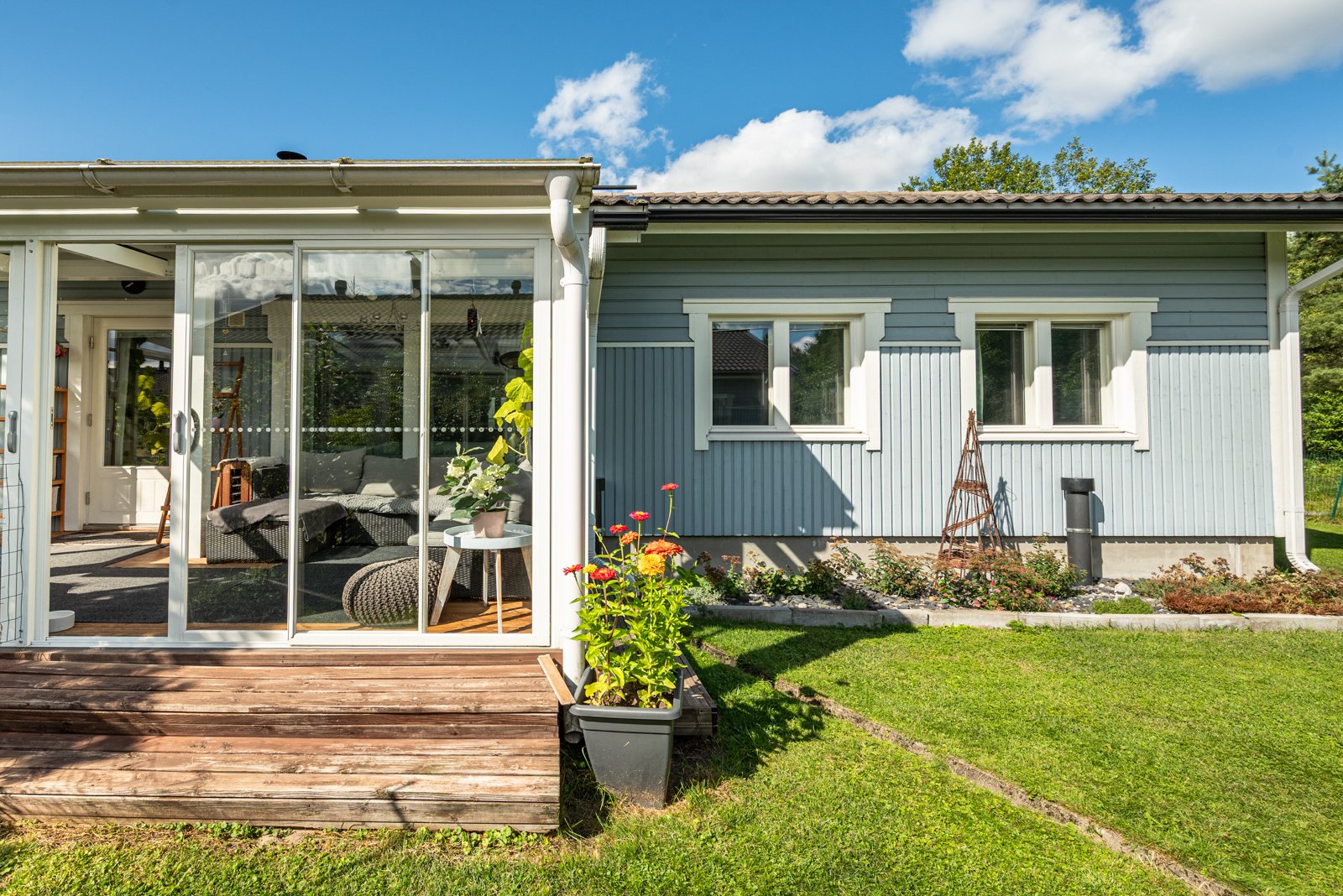 Olohuoneesta avautuu upea lasitettu terassi, joka toimii kodin lisähuoneena melkein ympäri vuoden – täydellinen paikka rentoutumiseen, aamukahville tai illanviettoihin ystävien tai perheen kanssa. Tilava piha tarjoaa puutarhaharrastajalle monipuoliset mahdollisuudet: kasvihuone, pergola ja istutusalueet tarjoavat virherpeukalolle mahdollisuuksia ja leikkimökki tuo iloa lapsille.
