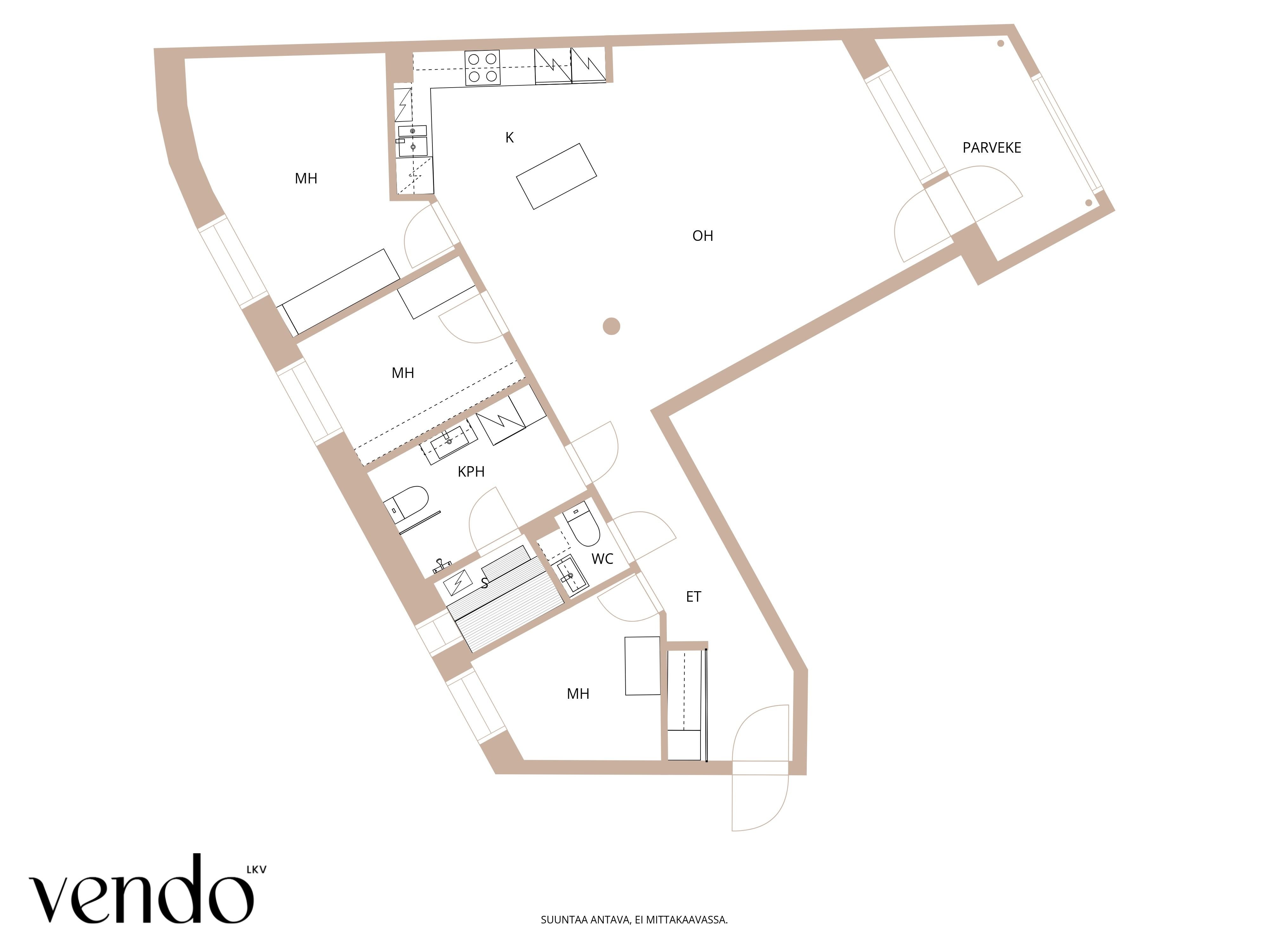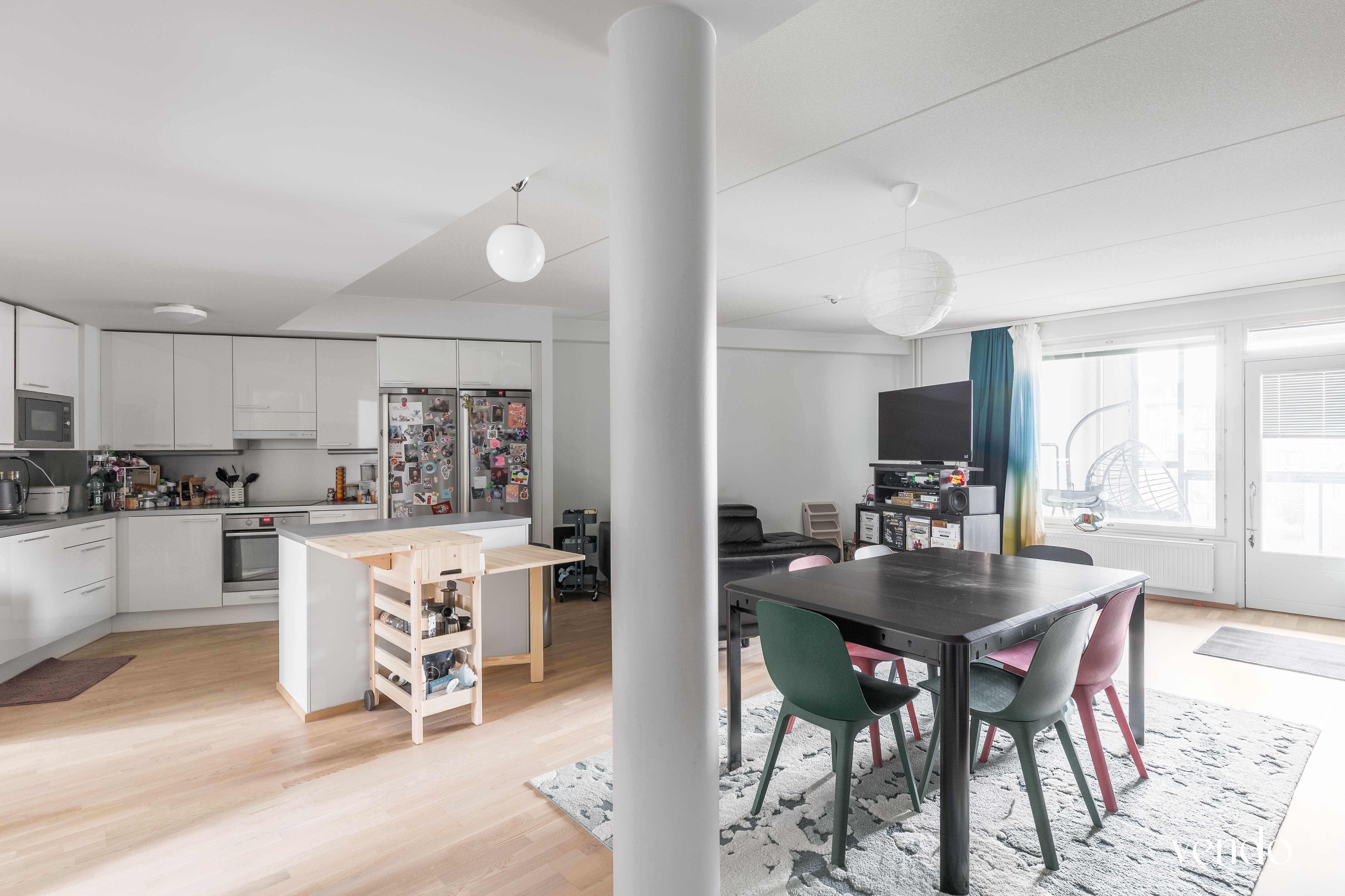 Huoneisto on valoisa ja käytännöllinen — avokeittiö saarekkeineen ja laadukkaine kodinkoneineen sulautuu luontevasti suureen olohuoneeseen, jossa on tilaa niin ruokailulle kuin oleskelullekin. Asunnossa on kolme makuuhuonetta, erillinen WC, oma sauna ja tilava kylpyhuone lattialämmityksellä.