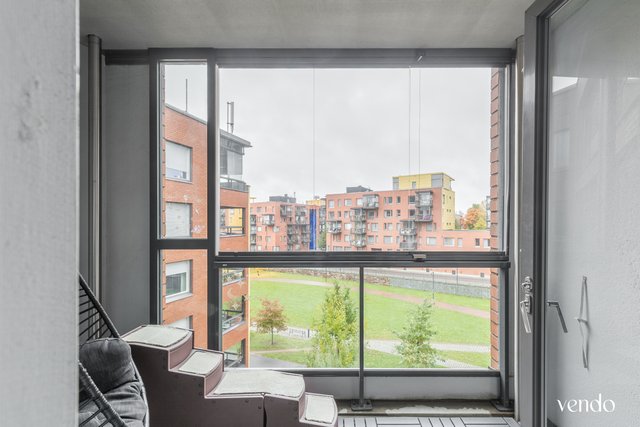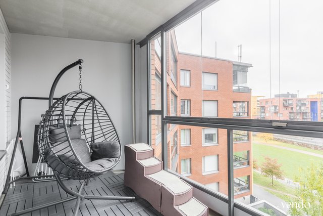 Etelään avautuva lasitettu parveke toimii kuin lisähuone suurimman osan vuodesta ja tarjoaa rauhalliset näkymät sisäpihan suuntaan. Huoneiston pohjaratkaisu on tehokas ja selkeä, ja kaikki materiaalit ovat laadukkaita ja ajattomia.
