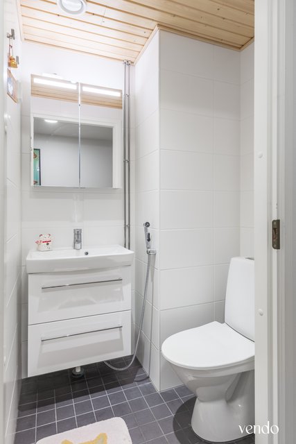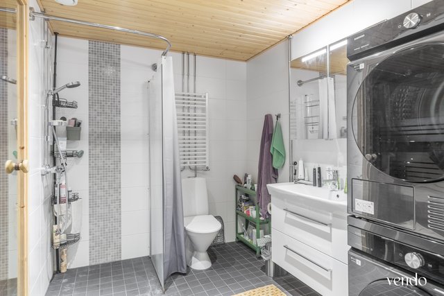 - WC-istuin, suihku, suihkuseinä, pesukoneliitäntä, lattialämmitys, peilikaappi, pesuallas, allaskaappi, ja bidee-suihku