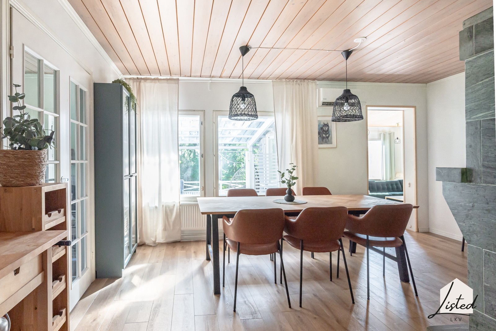 Sisätilat on remontoitu ajatuksella ja laadukkailla materiaaleilla. Keittiö, kylpyhuone, sauna ja wc-tilat ovat saaneet uuden ilmeen vuosina 2022-2023, ja kaikki sisäpinnat, lattiat sekä kattopaneelit on uusittu. Keittiössä on modernit kodinkoneet ja saareke, joka kutsuu yhteisiin kokkailuhetkiin. Viisi makuuhuonetta tarjoavat jokaiselle perheenjäsenelle oman rauhallisen tilan.