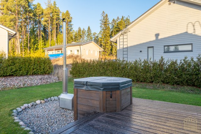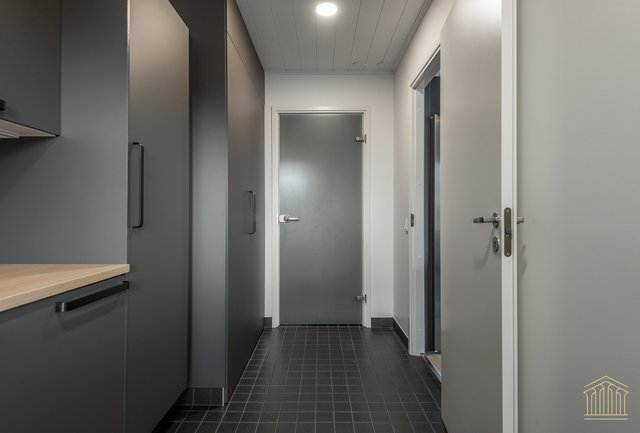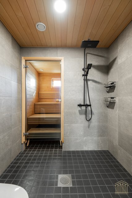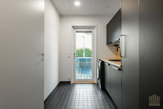 Arjen helppouden takaa kodinhoitohuone omalla sisäänkäynnillä, josta avautuu suora kulku saunasta paljuun. Kylpyhuoneessa laadukkaan ilmeen aikaansaamiseksi on laattavalinnat otettu Pukkilan mallistosta ja saunassa löylyt tarjoaa Harvian pilarikiuas.