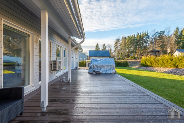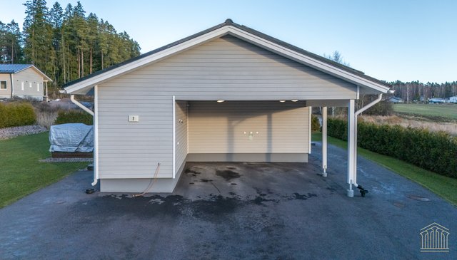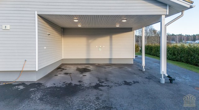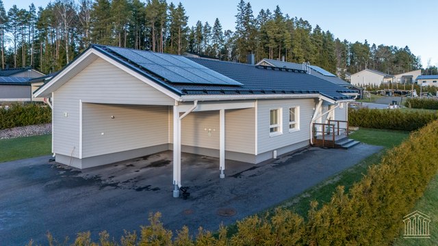 Kokonaisuutta täydentää kahden auton autokatos, lämmin ulkovarasto sekä asfaltilla päällystetty piha.
