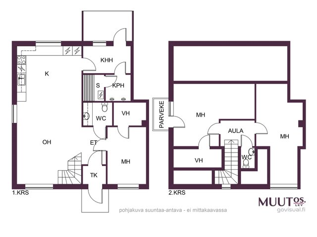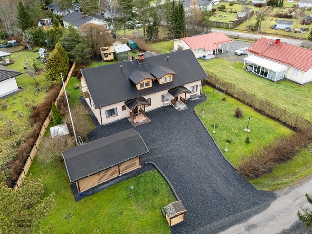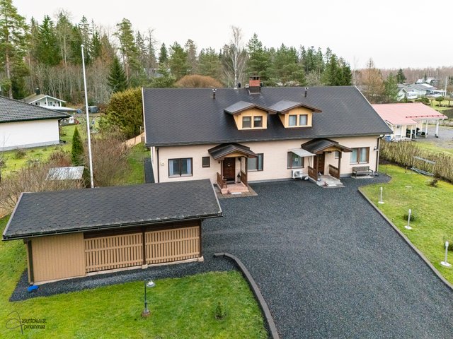 - Pinta-alat perustuvat myyjältä saatuihin tietoihin ja rakennuspiirustuksista laskettuihin arvioihin. Pinta-aloja ei ole tarkistusmitattu, mitattaessa pinta-alat saattavat olla ilmoitettua suurempia tai pienempiä. Kohteen kauppahinta ei ole osaksikaan pinta-alaperusteinen vaan perustuu kokonaisuuteen. Rakennuspiirustusten mukainen kerrosala 281 m2, kerrosala ja huoneistoala A 128m2 ja B 112m2 yhteensä 240m2. Asuintilojen pinta-ala on laskettu rakennuspiirustuksista ja siihen on huomioitu kaikki asuinkäytössä olevat tilat, muihin tiloihin on laskettu autotalli ja varasto.