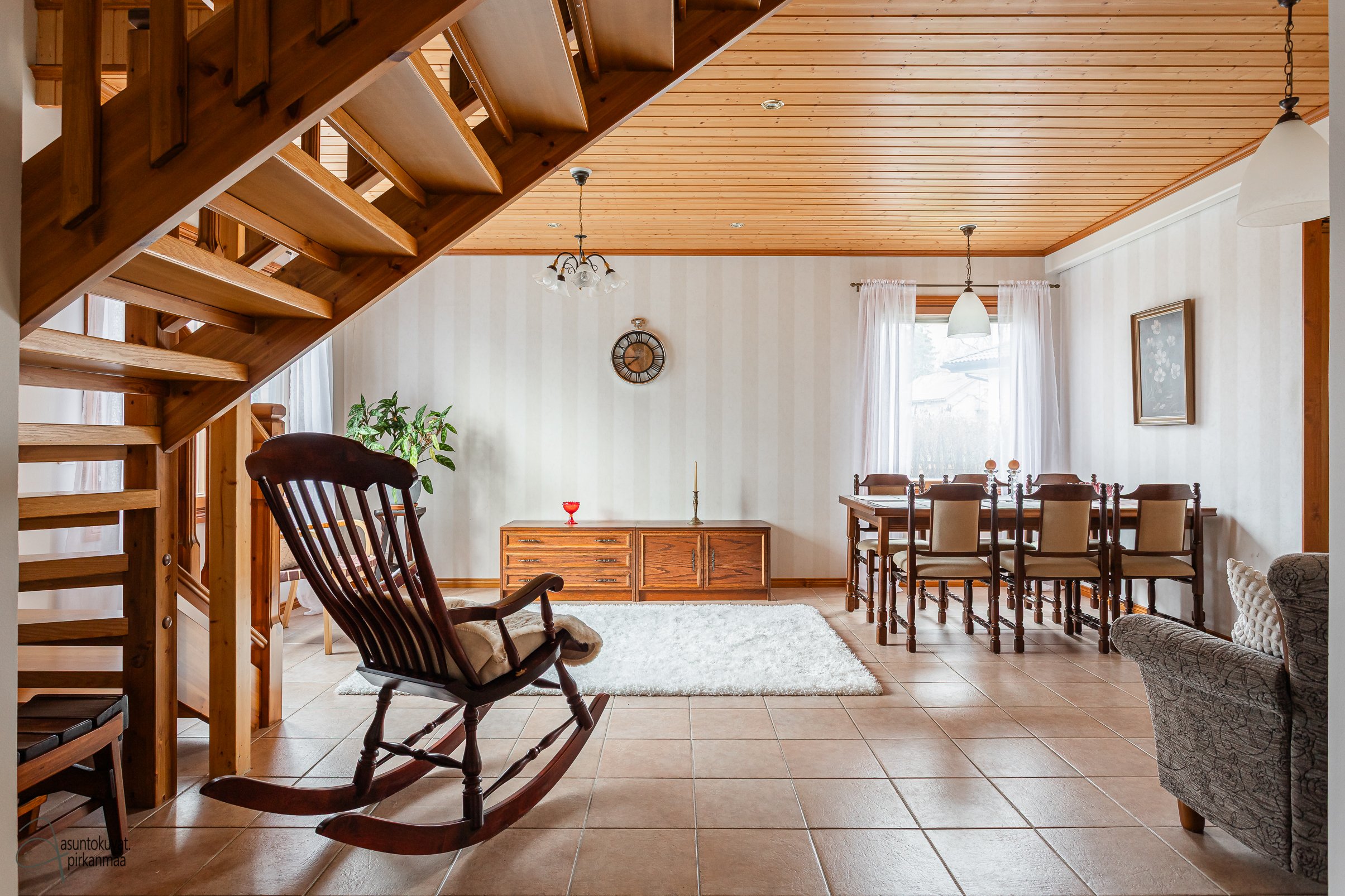 Alakerrassa sijaitsee avara olohuone, sekä takkahuone jossa on kaunis varaava takka, joka luo lämpöä ja tunnelmaa talvi-iltoihin. Alakerrasta löytyy myös kodinhoitohuone, josta on oma uloskäynti, joka lisää arjen sujuvuutta.