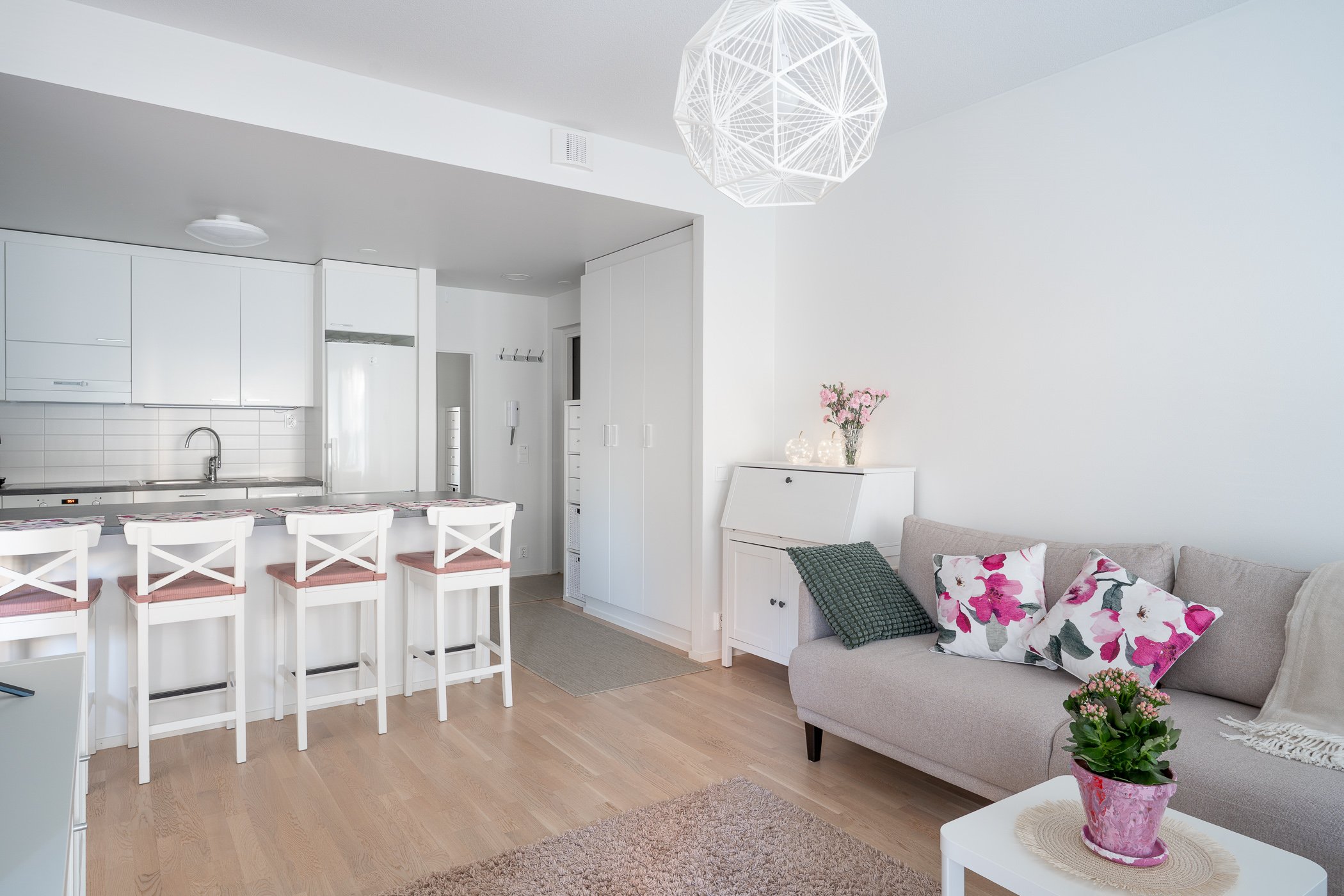 Tämä viihtyisä ja fiksusti suunniteltu kolmannen kerroksen koti on täydellinen valinta sinulle, joka arvostat tehokasta tilankäyttöä ja arjen helppoutta. Keittiö ja olohuone muodostavat toimivan yhtenäisen tilan. Tilan jakajana toimii iso saareke, joka tarjoaa niin säilytys- ja työtilaa, kuin ruokailupaikan. Olohuoneen jatkeena avautuu länteen iso lasitettu parveke.