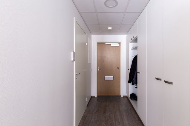 - Eteisen lattia on laminaattia, seinät on maalattu, naulakko ja kaapisto.