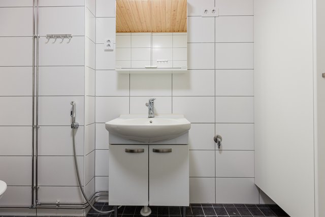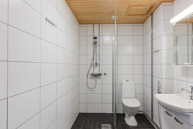 - WC-istuin, suihku, suihkuseinä, pesukoneliitäntä, lattialämmitys, peilikaappi, pesuallas, allaskaappi, ja bidee-suihku