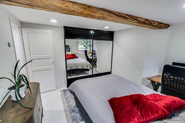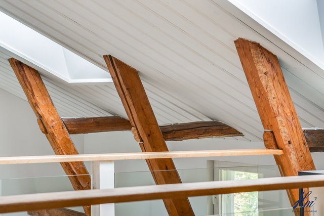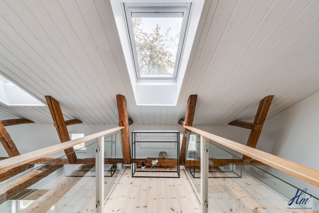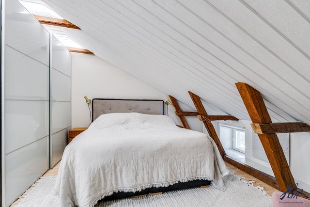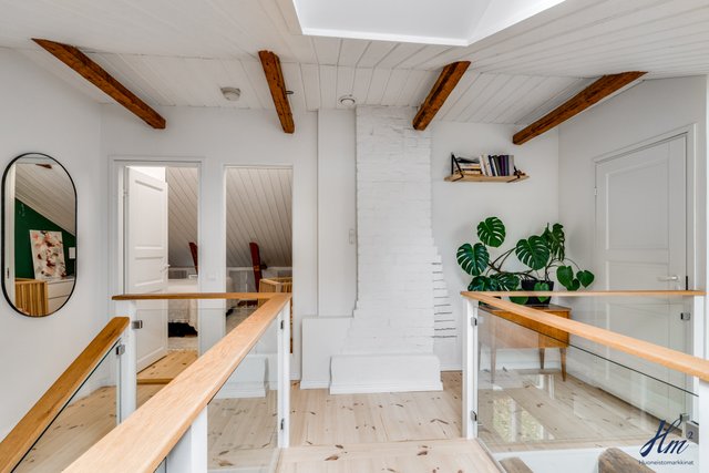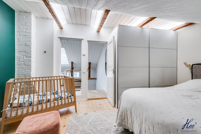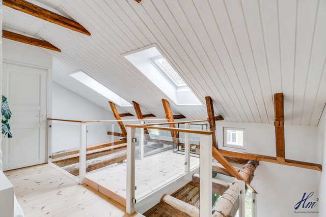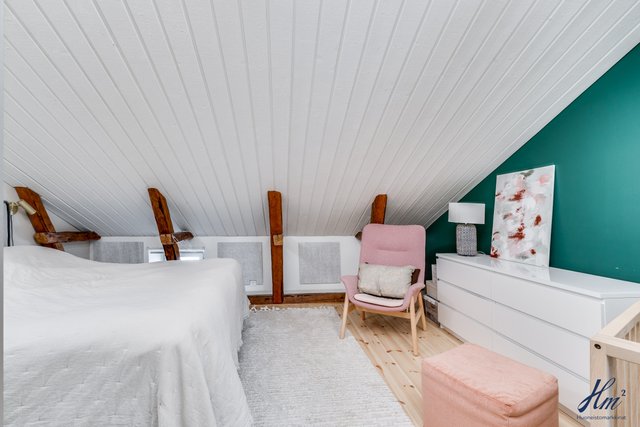 Yläkerrassa sijaitsee asunnot toinen makuuhuone ja wc. Myös työpisteelle löytyy oma tilansa valoa tulvivan kattoikkunan alla.