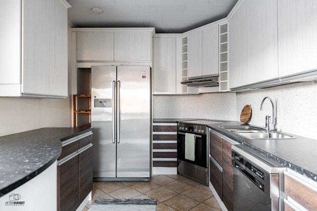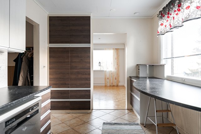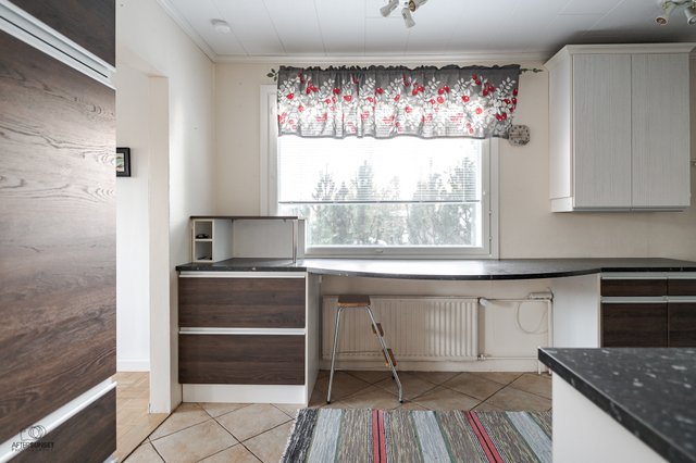 - Keittiön tasot, kaapinovet, välitilan levyt, liesi ja liesituuletin uusittu vuonna 2017. Varustus: Jääkaappipakastin, lattialiesi (keraaminen), astianpesukone, liesituuletin, kiinteät kaapistot ja kiinteät valaisimet Materiaalit: Työtasot laminaattia, lattiapinnat laatoitettu, välitila levytetty ja seinäpinnat maalattu.