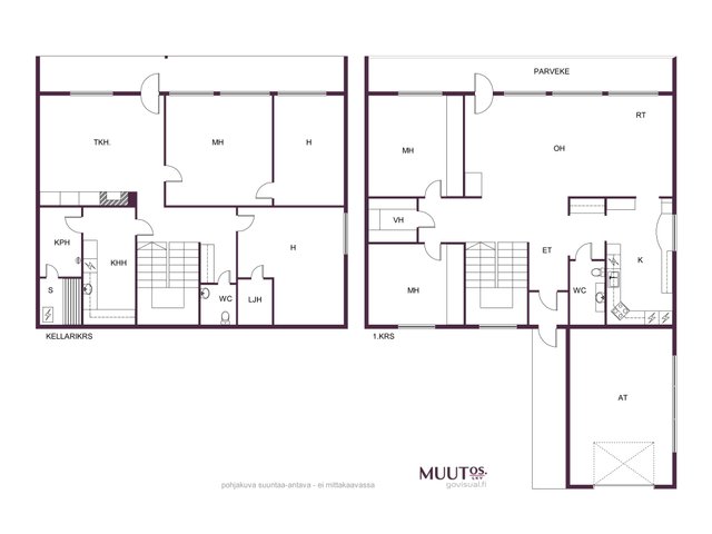 - Pinta-alat perustuvat myyjältä saatuihin tietoihin ja rakennuspiirustuksista laskettuihin arvioihin. Pinta-aloja ei ole tarkistusmitattu, mitattaessa pinta-alat saattavat olla ilmoitettua suurempia tai pienempiä. Kohteen kauppahinta ei ole osaksikaan pinta-alaperusteinen vaan perustuu kokonaisuuteen. Rakennuspiirustusten mukainen kerrosala 273,9 m2. Asuintilojen pinta-ala on laskettu rakennuspiirustuksista ja siihen on huomioitu kaikki asuinkäytössä olevat tilat, muihin tiloihin on laskettu autotalli, takkahuone ja varasto.