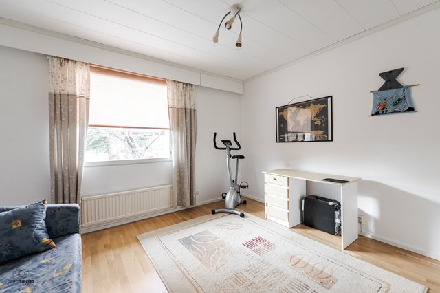 - Materiaalit: Lattiapinnat laminaatti ja seinäpinnat tapetoitu ja osittain maalattu. Takkaseinä tiiliverhoiltu.
