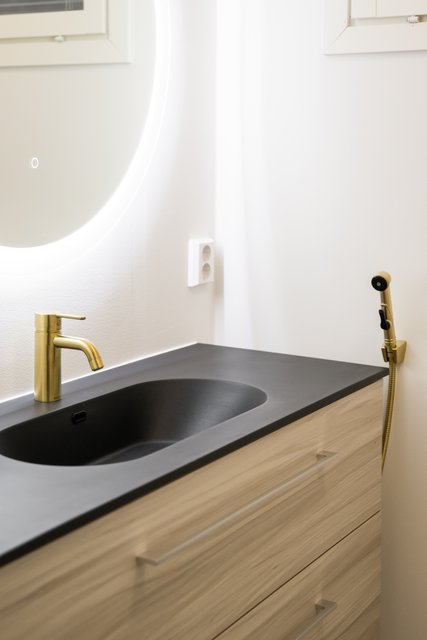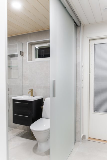 - WC-istuin, suihku, suihkuseinä, pesuallas, ja allaskaappi