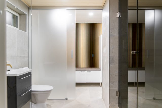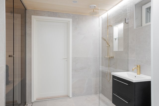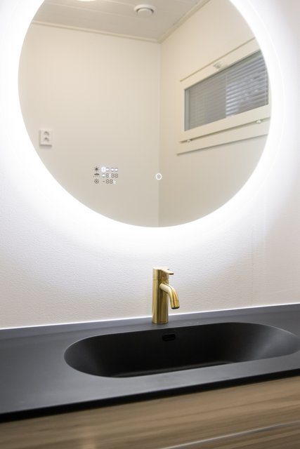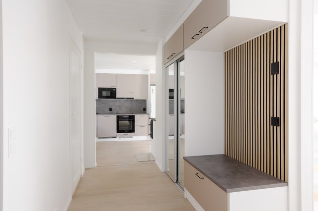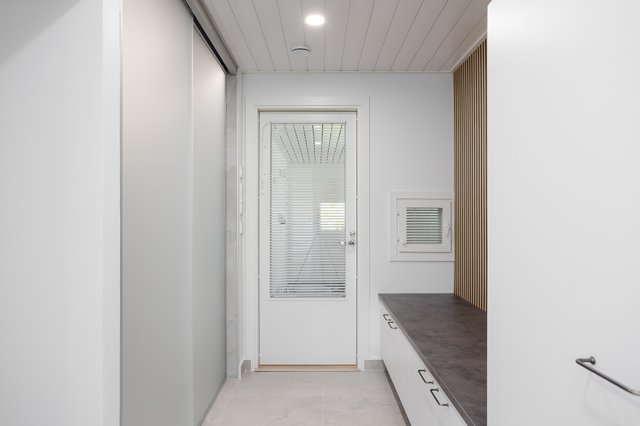 - Pesukoneliitäntä, lattialämmitys, pöytätaso, pyykkikaapit, ja tila pesutornille