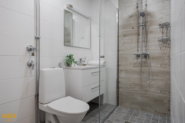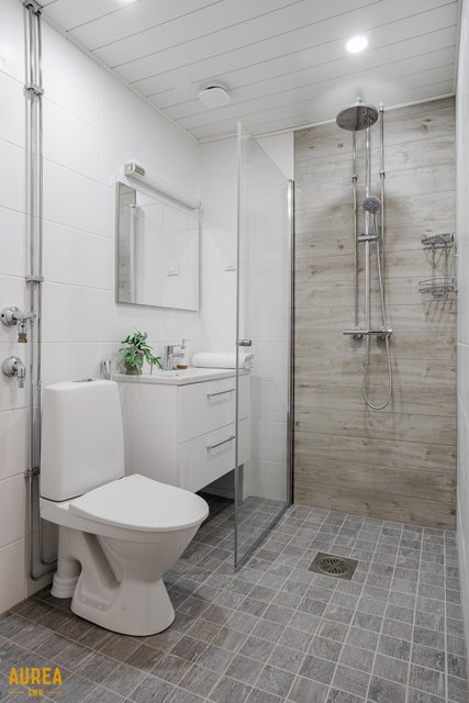 - WC-istuin, suihku, suihkuseinä, pesukoneliitäntä, lattialämmitys, peili, pesuallas, allaskaappi, ja bidee-suihku