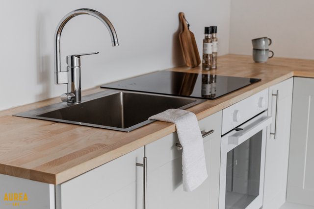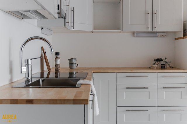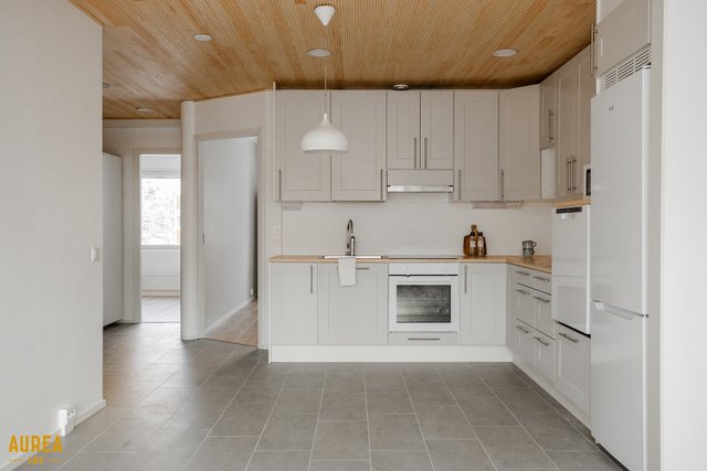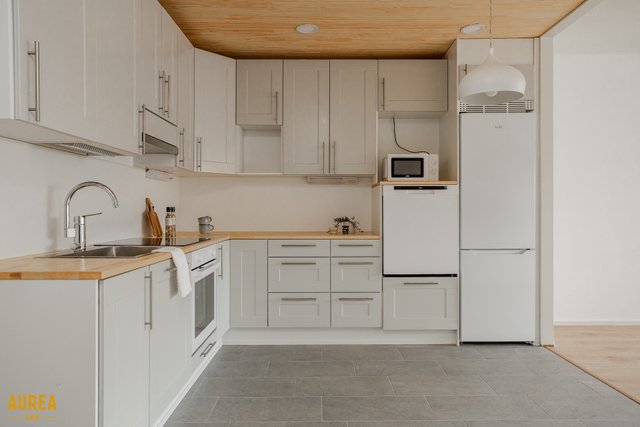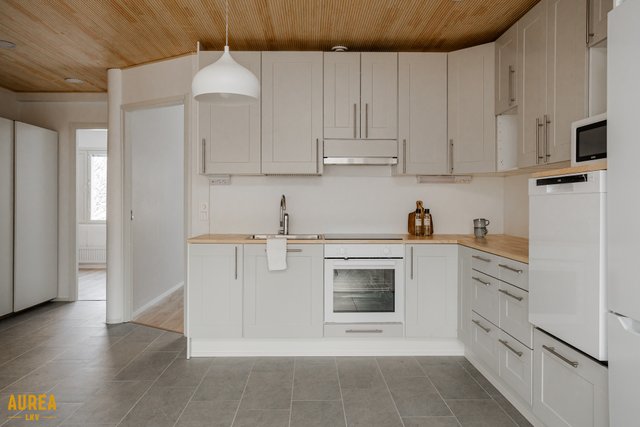 - Keittiö remontoitu 2025. Harmaat kaapistot, vaaleat puu tasot, välitilassa levy.