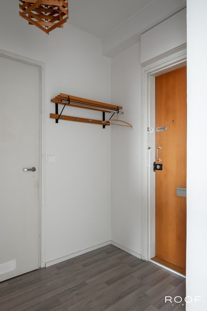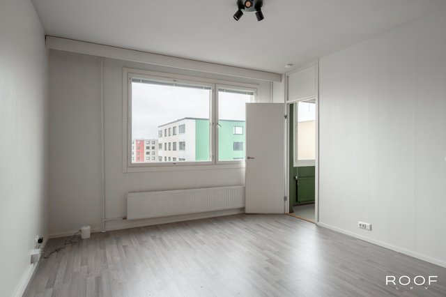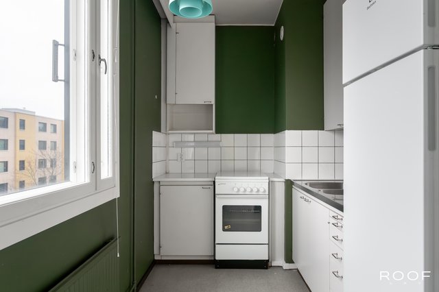 Kuudennessa kerroksessa sijaitsevasta asunnosta avautuvat avarat näkymät kaupungin ylle. Kompakti ja toimiva keittiö palvelee arjen tarpeita sellaisenaan ja tarjoaa haluttaessa mahdollisuuden päivittää ilmettä omien toiveiden mukaisesti.