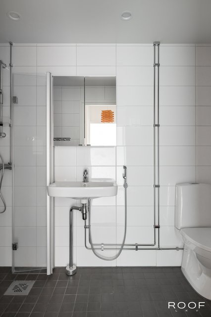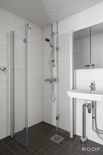 - Kylpyhuone on selkeälinjainen ja hyvin toimiva kokonaisuus. Seinät ja lattia on laatoitettu, ja tilassa on suihku lasisella suihkuseinällä sekä lattiakaivo. Varustukseen kuuluvat pesuallas, peilikaappi ja wc-istuin. Kylpyhuone on käytännöllinen arjessa sellaisenaan.
