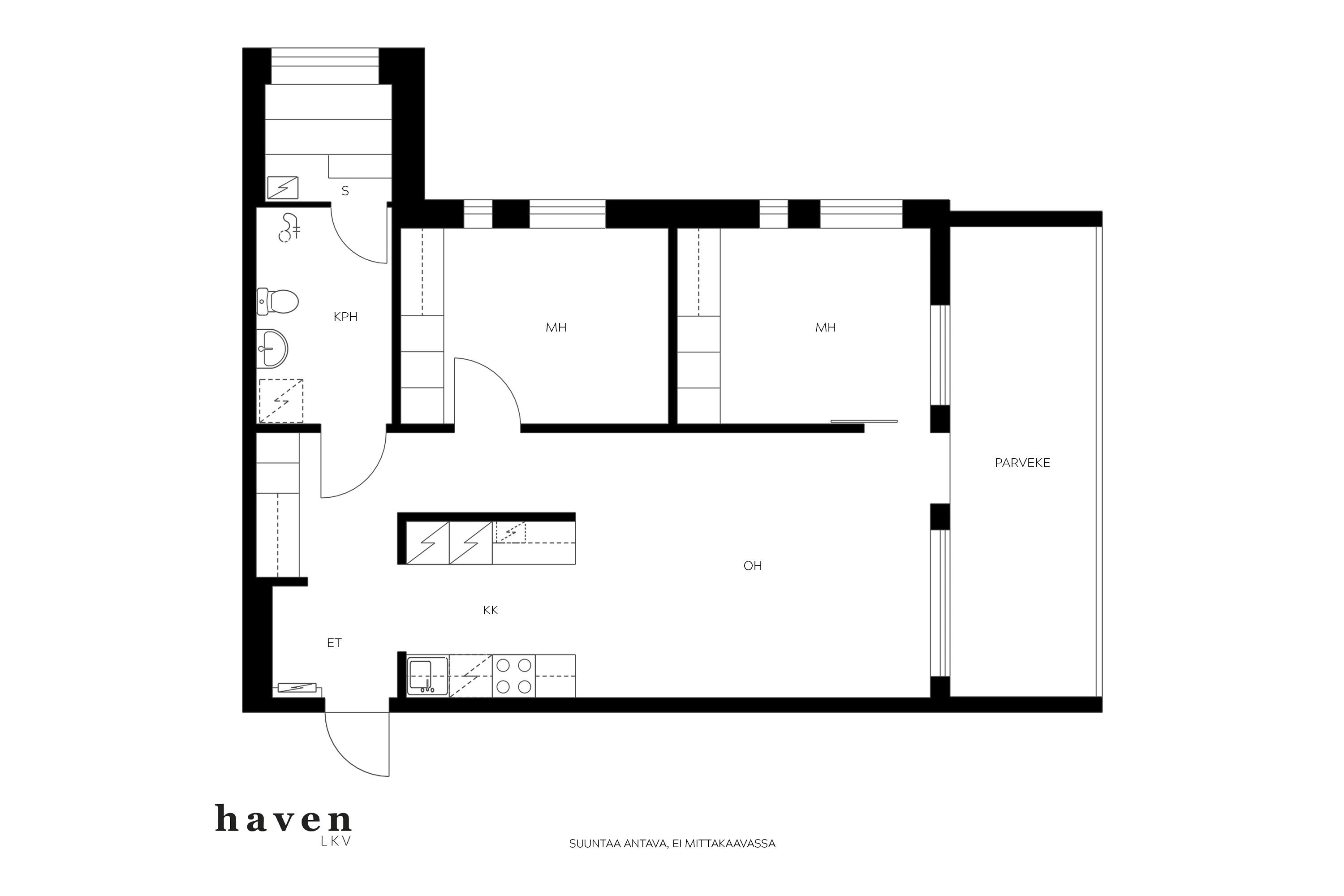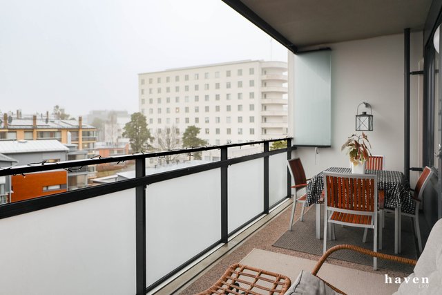 Asunnossa on kaksi makuuhuonetta, avara olohuone sekä käytännöllinen keittokomero. Kylpyhuoneessa on lattialämmitys ja oma sauna, joka tuo arkeen ripauksen luksusta. Lasitettu parveke toimii lisätilana ja tarjoaa rauhallisen paikan nauttia ilta-auringosta.