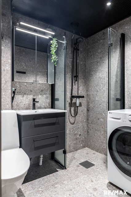 - Suihku, wc-istuin, suihkuseinä, pesukoneliitäntä, peilikaappi, allaskaappi, ja bidee-suihku