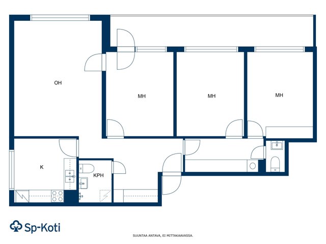 Vuokrattu tilava 91,5 m²:n asunto tarjoaa erinomaiset puitteet perheelle. Kolmannen kerroksen kulma-asunnossa on kolme makuuhuonetta, olohuone, keittiö, pesuhuone ja erillinen wc. Asunnon länteen avautuva lasitettu parveke tarjoaa rauhallisen paikan rentoutua iltaisin.