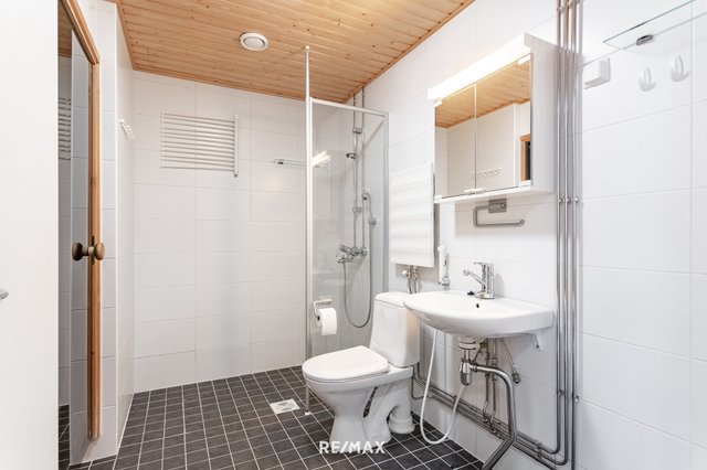 - Bidee-suihku, suihkuseinä, peilikaappi, lattialämmitys, pesukoneliitäntä, wc-istuin, ja suihku