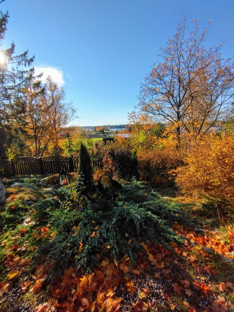 Etupihaa hallitsee kotipuu; suuri vaahtera,joka suojaa tehokkaasti pihaa ja rakennusta tuulilta ja paahteelta. Piha säilyy helteilläkin viileänä järveltä puhaltavan tuulen ansiosta. Kasvillisuus on suunniteltu luonnon monimuotoisuutta kunnioittaen.