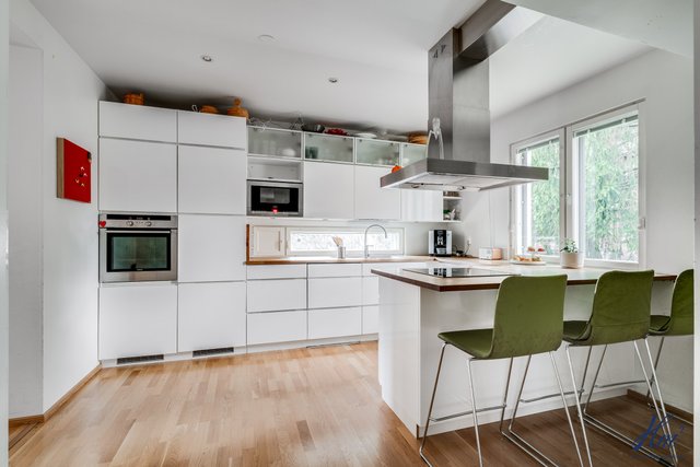 - Jääkaappipakastin, erillisuuni, liesi, liesituuletin, mikroaaltouuni, astianpesukone, ja keittiösaareke