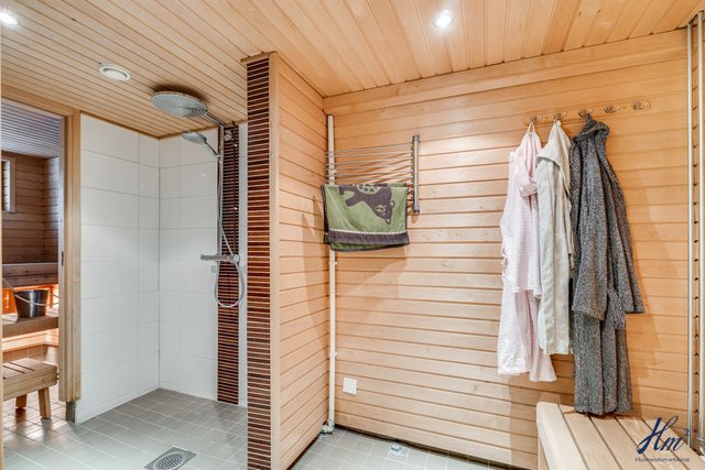- Suihku 2 kerroksessa: Suihku, suihkuverho, Wc-istuin, bidee-suihku, pesuallas, allaskaappi, peilikaappi. Pesuhuone alakerrassa: Suihku, pukeutumis-tila, poreallas varaus, alakerran pesuhuoneen suihkusekoittaja sekä suihku vaihdetaan uuteen ennen hallinnan luovutusta.