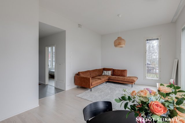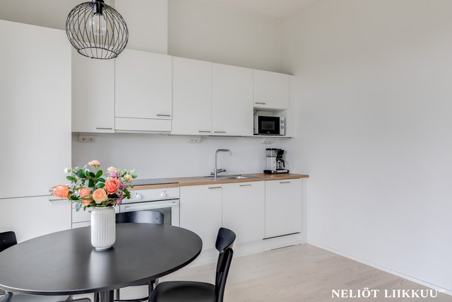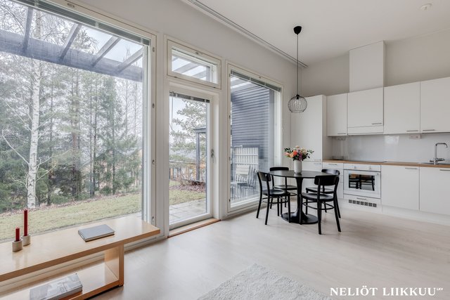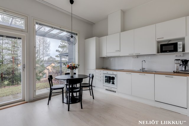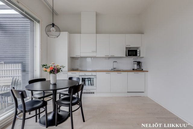 - Avokeittiö sulautuu saumattomasti olohuoneeseen, luoden avaran ja yhtenäisen oleskelutilan. Keittiön vaaleat pinnat korostavat luonnonvaloa ja tekevät asunnosta raikkaan ja kutsuvan.