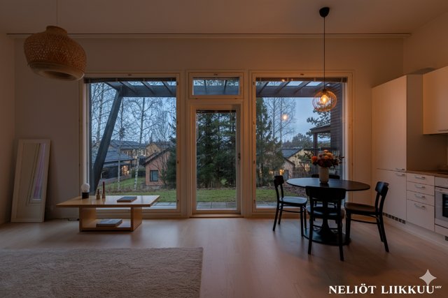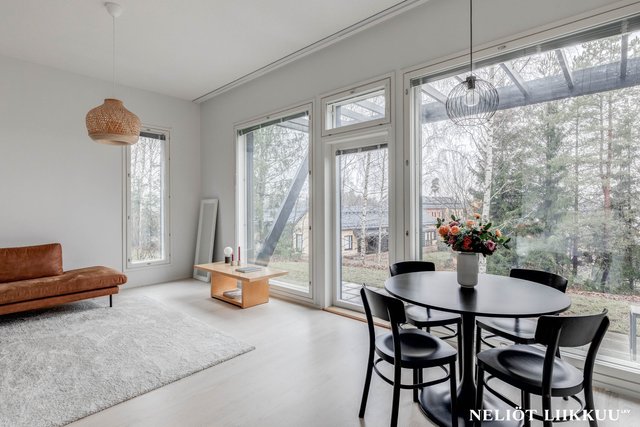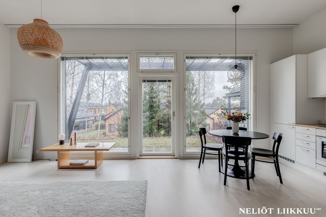 - Normaalia korkeampi huonekorkeus tuo tilaan ylellisyyden tuntua ja lisää avaruutta. Olohuoneen suurista ikkunoista luonnonvalo tulvii sisään ja suora kulku omalle takapihalle tekee oleskelusta sujuvaa ja viihtyisää.