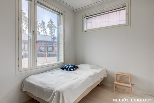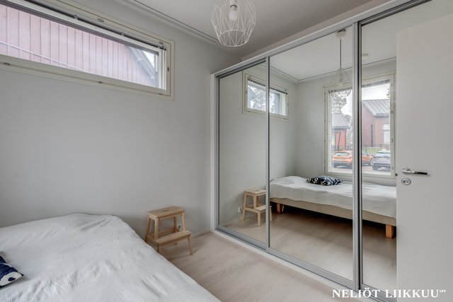 - Tilava makuuhuone tarjoaa rauhalliset puitteet lepoon ja käytännöllinen säilytystila peililiukuovilla viimeistelee kokonaisuuden. Peilipinnat lisäävät tilan tuntua ja tuovat arkeen ripauksen tyylikkyyttä.