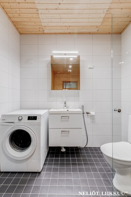- WC-istuin, pesukoneliitäntä, peilikaappi, allaskaappi, pesuallas, bidee-suihku, suihku, ja suihkuseinä