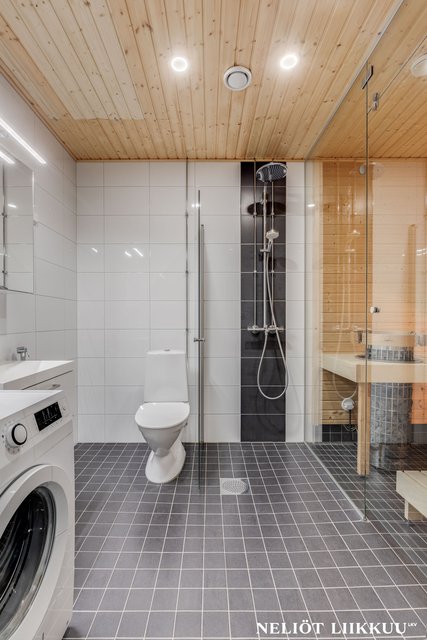 - Moderni ja tilava kylpyhuone hurmaa tyylikkäällä ilmeellään ja lasiseinällä erotettu sauna tuo tilaan ripauksen ylellisyyttä sekä spa-henkistä tunnelmaa.