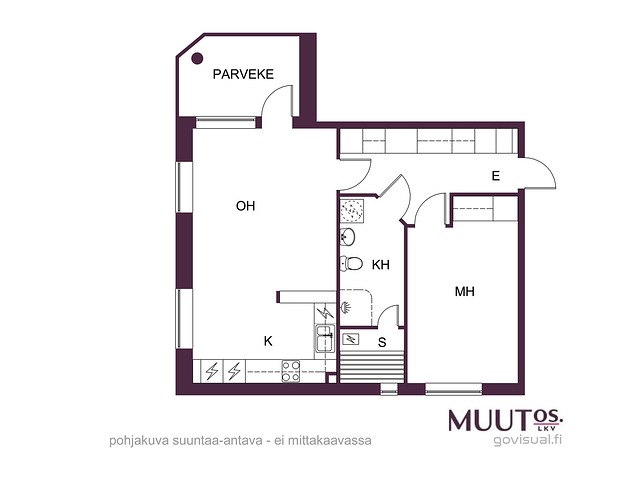 - Pinta-ala ei ole tarkistusmitattu. Pinta-ala saattaa poiketa olennaisestikin laskettavasta pinta-alasta. Todellinen pinta-ala voi siis olla esitteessä, yhtiöjärjestyksessä tai isännöitsijäntodistuksella mainittua suurempi tai pienempi. Hinta ei ole pinta-alaperusteinen. Yhtiöjärjestyksen mukainen huoneistoselitelmä: 2h+k+s