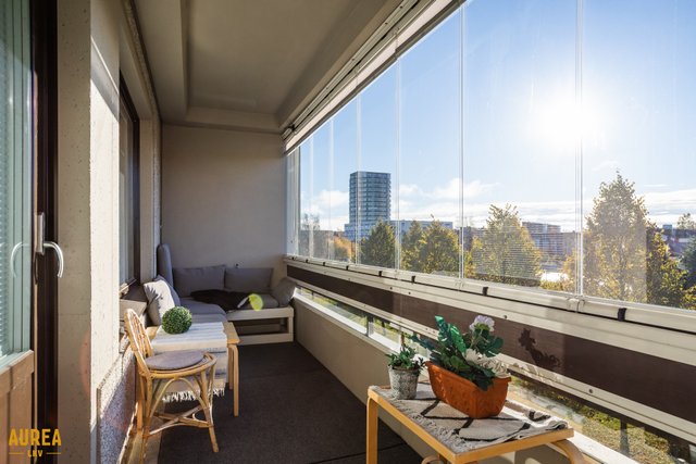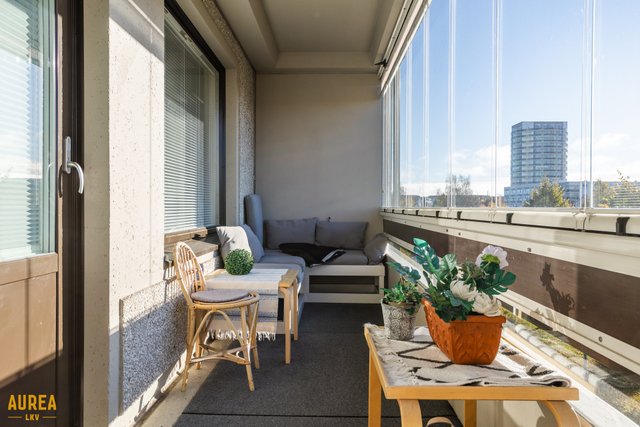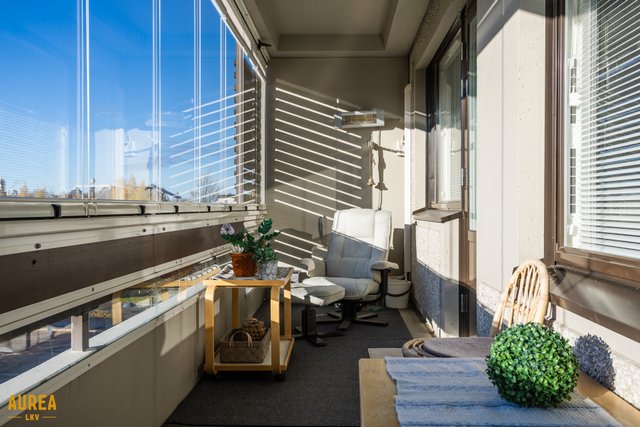 - Lisätietoja parvekkeesta: Huoneiston levyinen lasitettu parveke puistonäkymin etelään. Lasituksessa visorin kaihtimiet.
